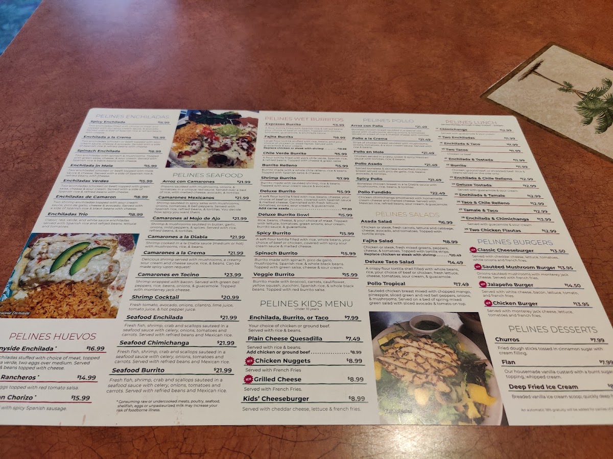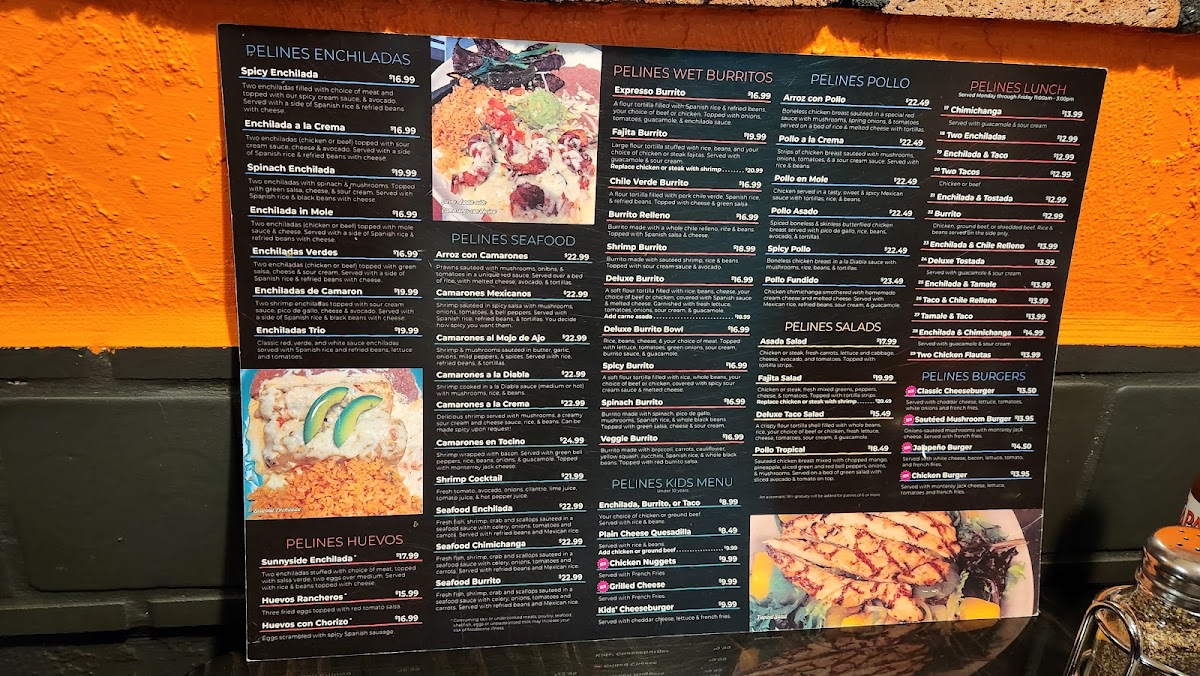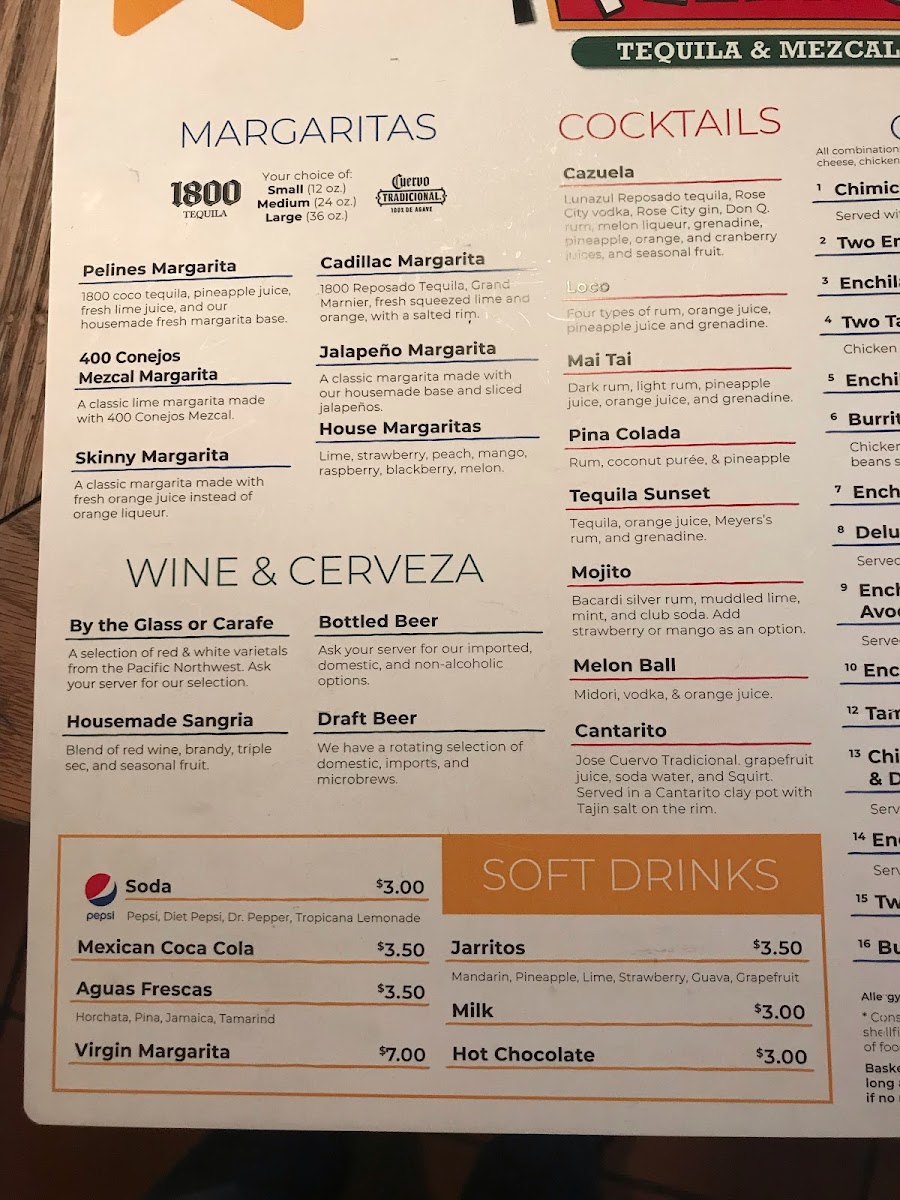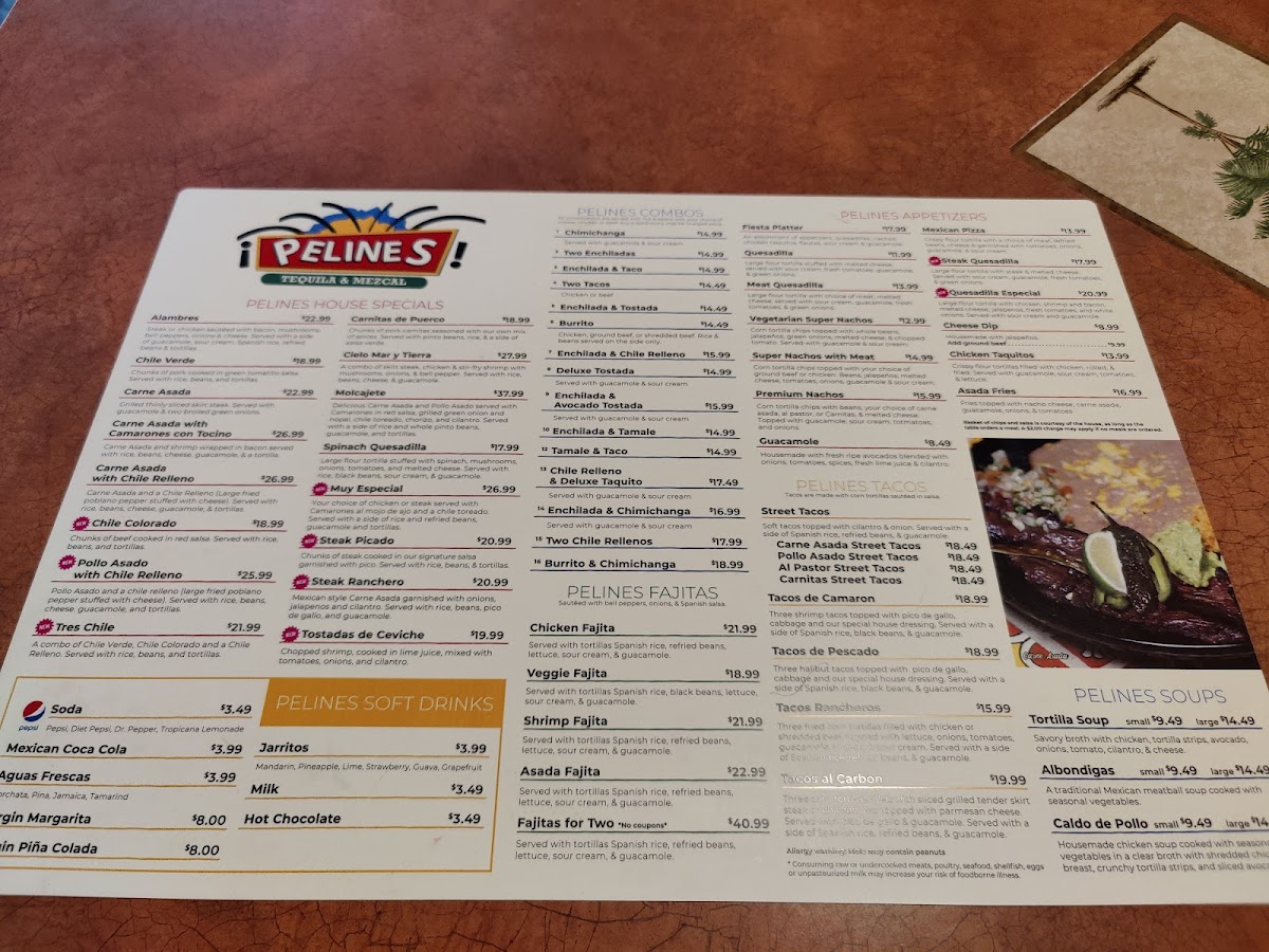The menu at Pelines Tequila and Mezcal features a variety of traditional Mexican dishes and beverages designed for casual dining experiences. It includes an assortment of appetizers, soups, main courses, drinks, and desserts, catering to different tastes and meal preferences.