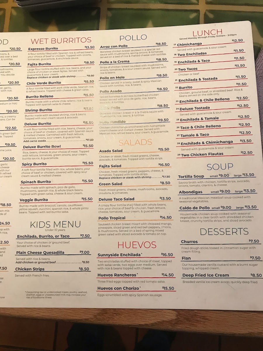 This menu suits guests seeking casual lunch or dinner options with authentic Mexican flavors. The variety of dishes allows for both light meals and more substantial orders, accommodating individual diners, families, and groups.