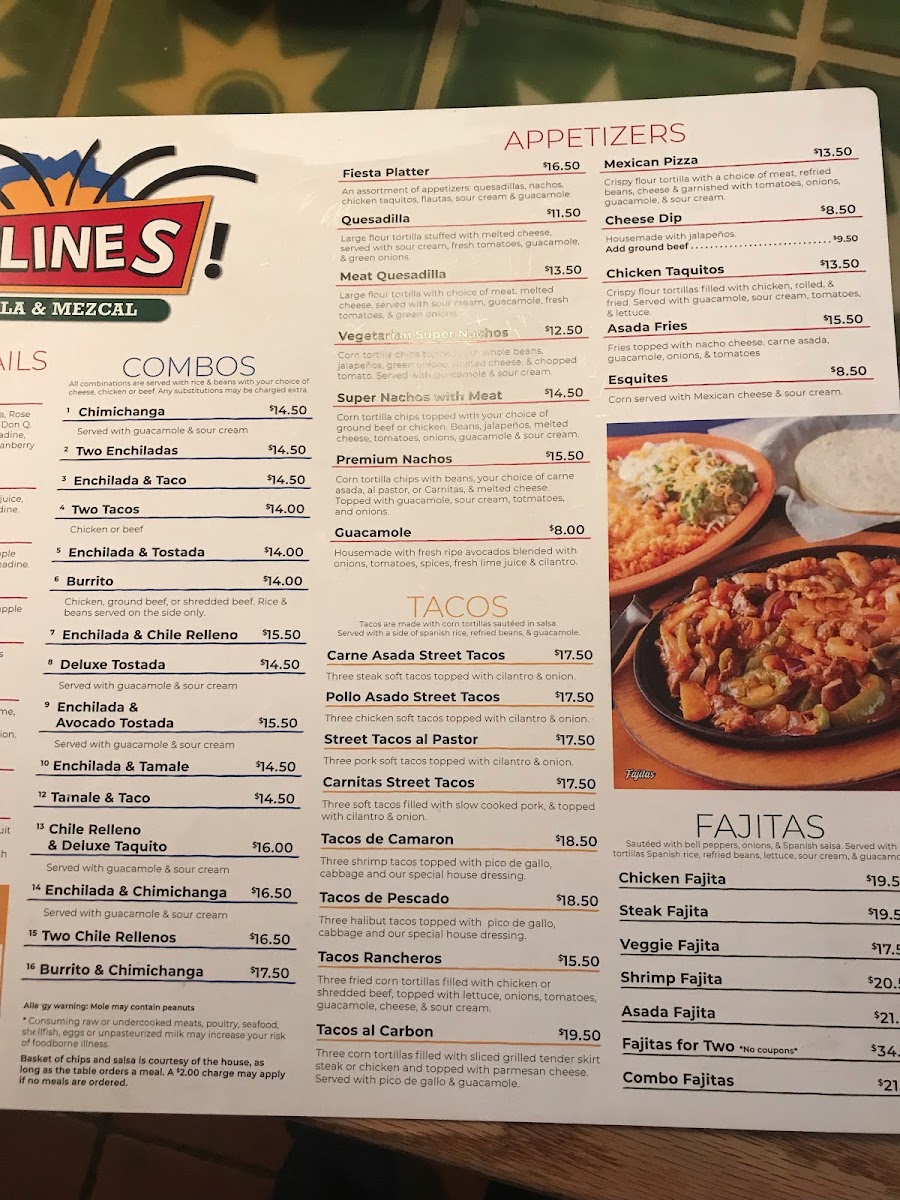 Main dishes offer a variety of Mexican favorites such as Arroz Con Pollo, Carne Asada with Chile Relleno, Fajitas (including options for two), and enchilada combinations. Other dishes include the Deluxe Tostada Combo, Quesadillas, and Tostada de Ceviche.